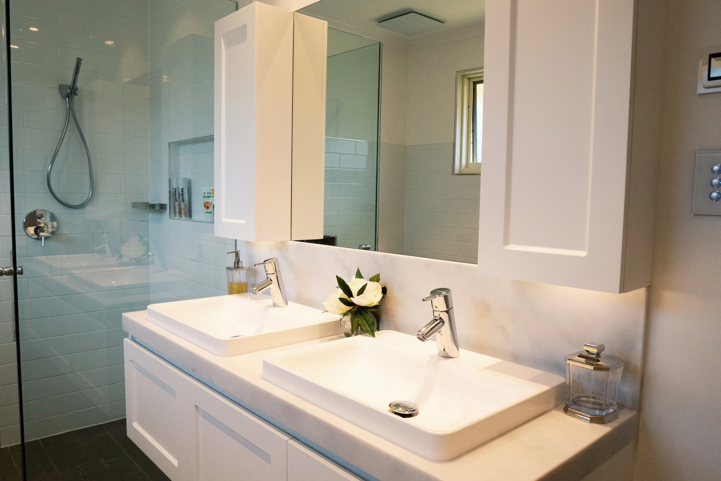 Devex in-tile heated flooring with touch controller, Havit recessed LED downlights, Clipsal Saturn series switch, 10mm Frameless shower screen, Highgrove bathtub, highgrove london series wall hung vanity, Villeroy & Boch toilet, Hansgrohe mixers, hardware by Cass brothers.